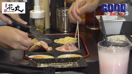 廣島燒:白蝦,五花腩肉,日本麵,廣島燒底漿,兩隻日本雞蛋